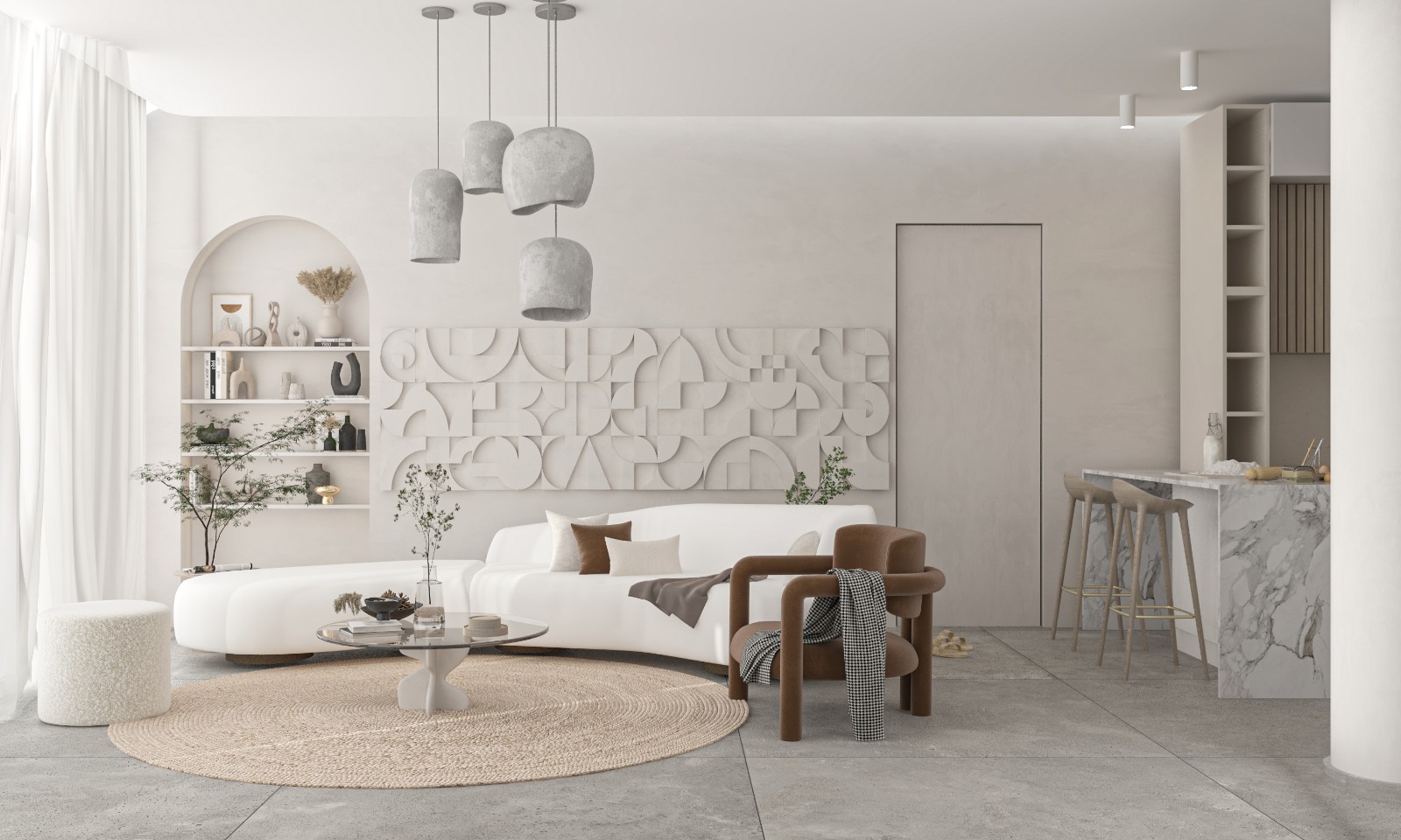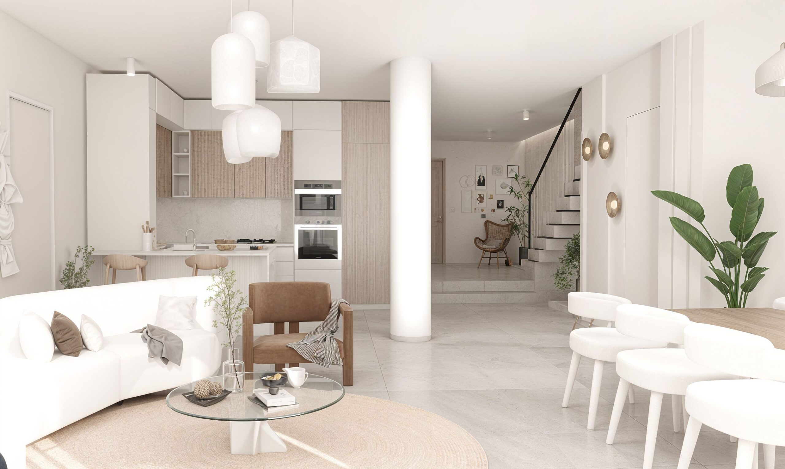 A modern twin villa designed with an open-plan layout that seamlessly connects living, dining, and kitchen areas. Soft neutral tones, natural materials, and abundant daylight create a calm and welcoming atmosphere, while clean lines and subtle textures add contemporary elegance suited to comfortable everyday living.