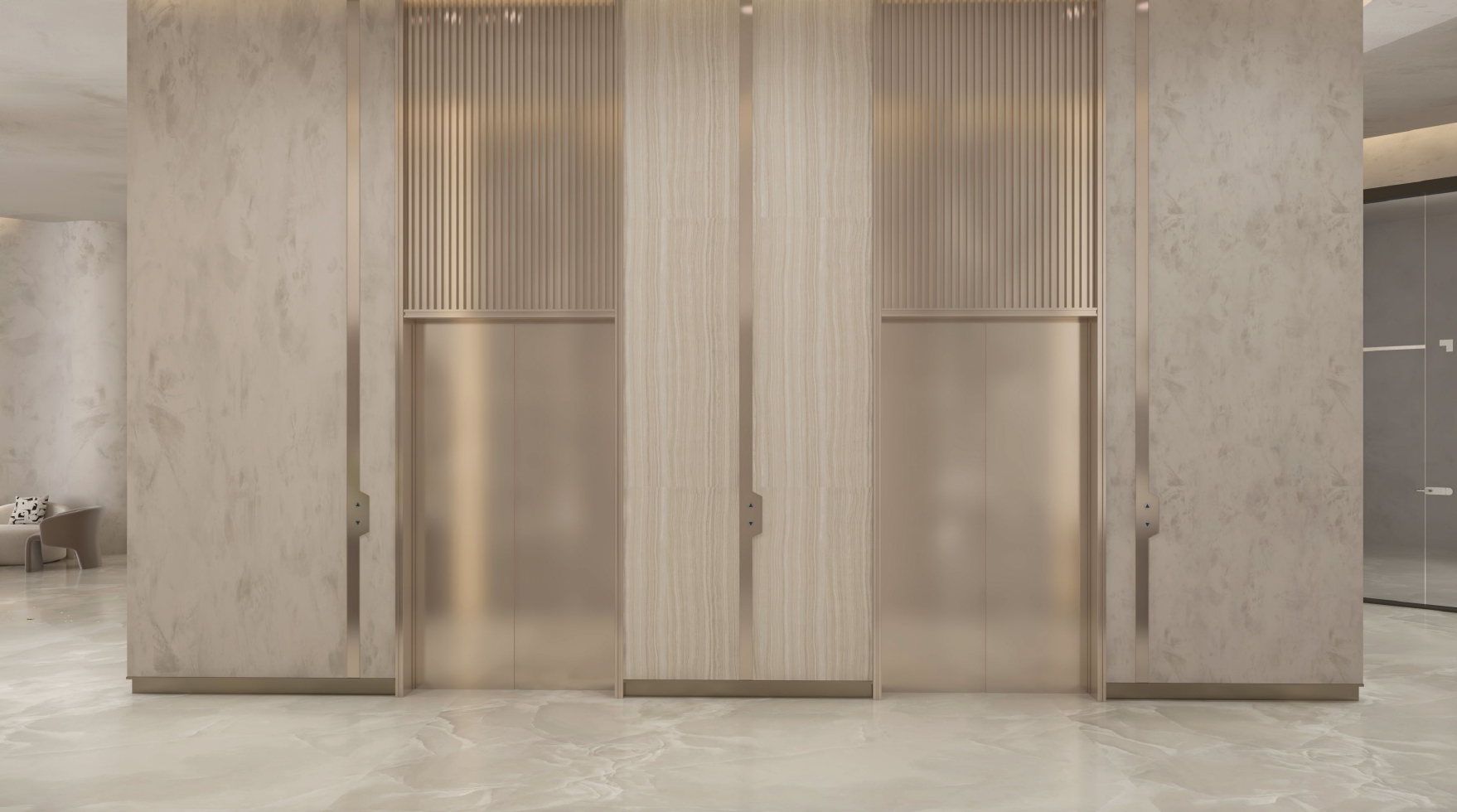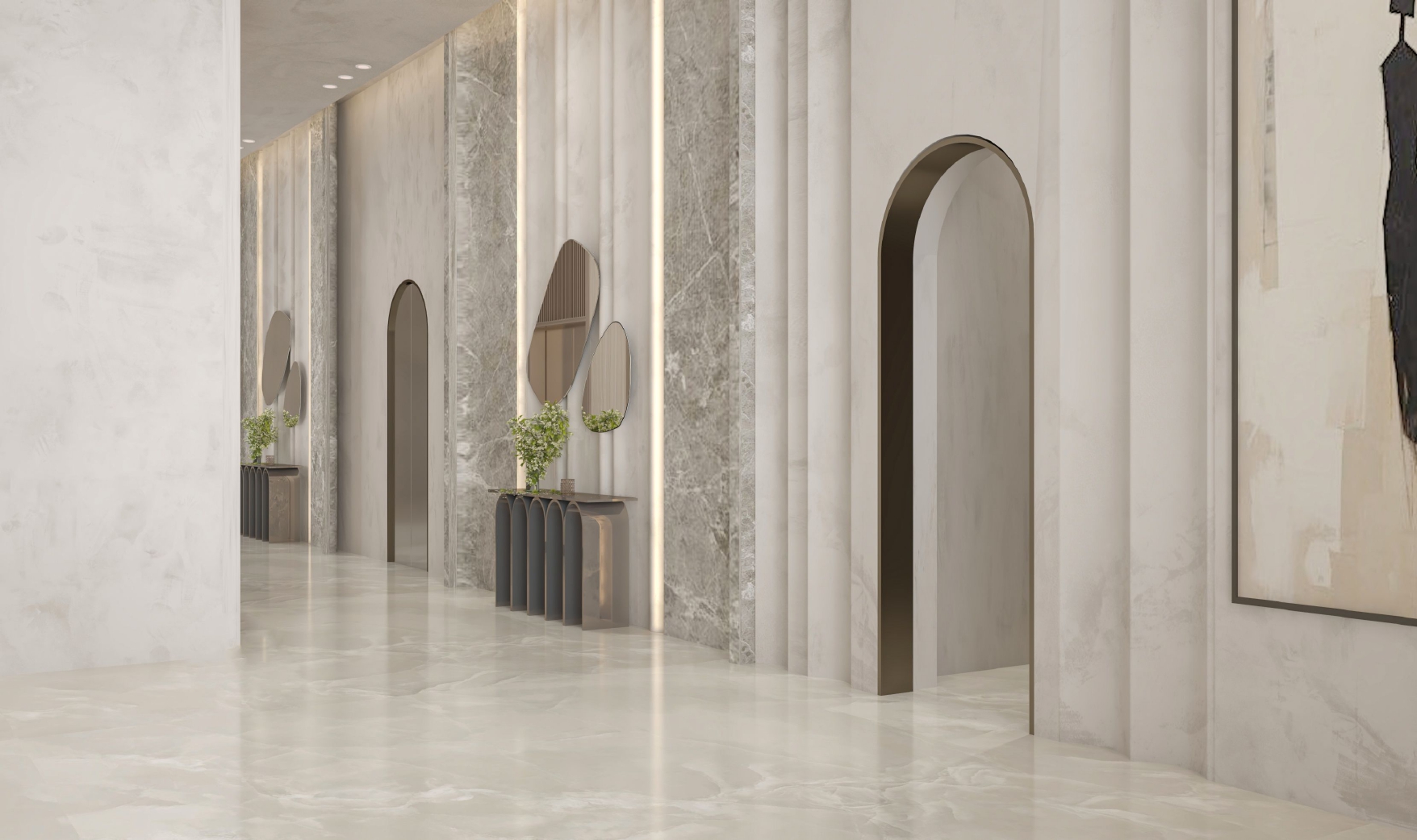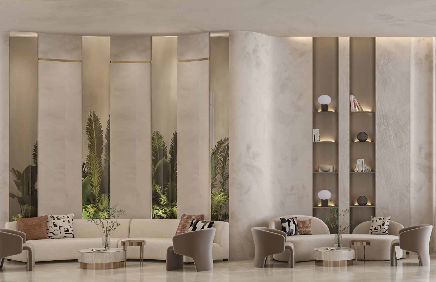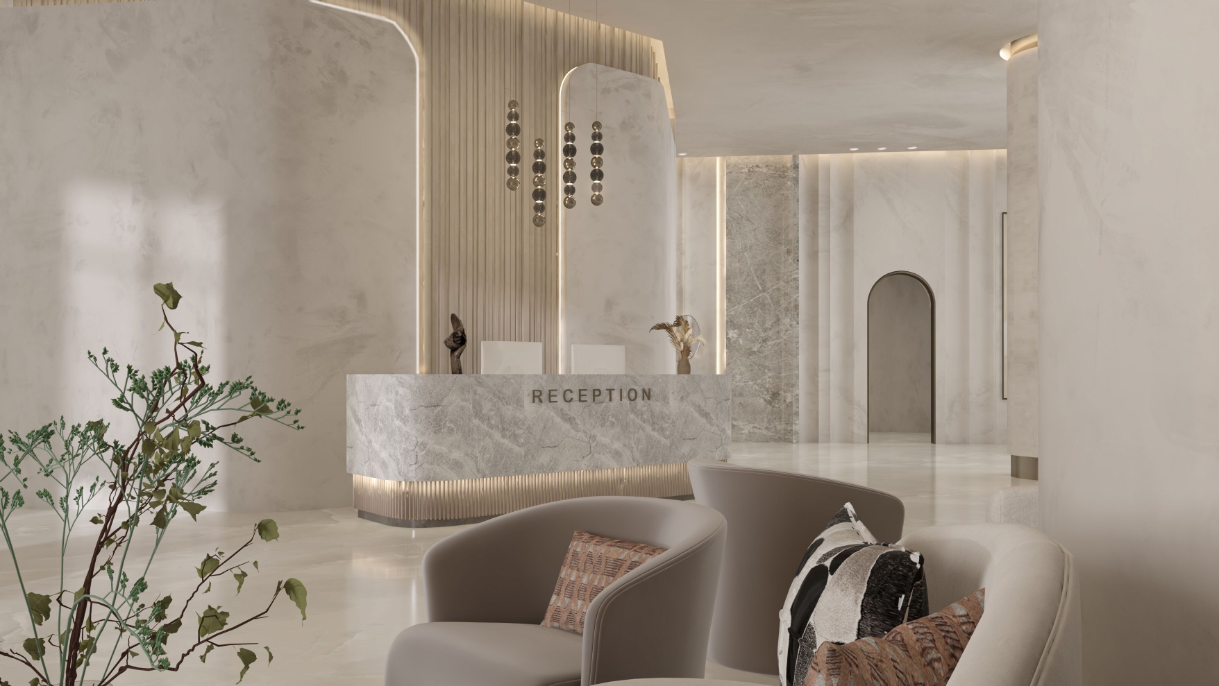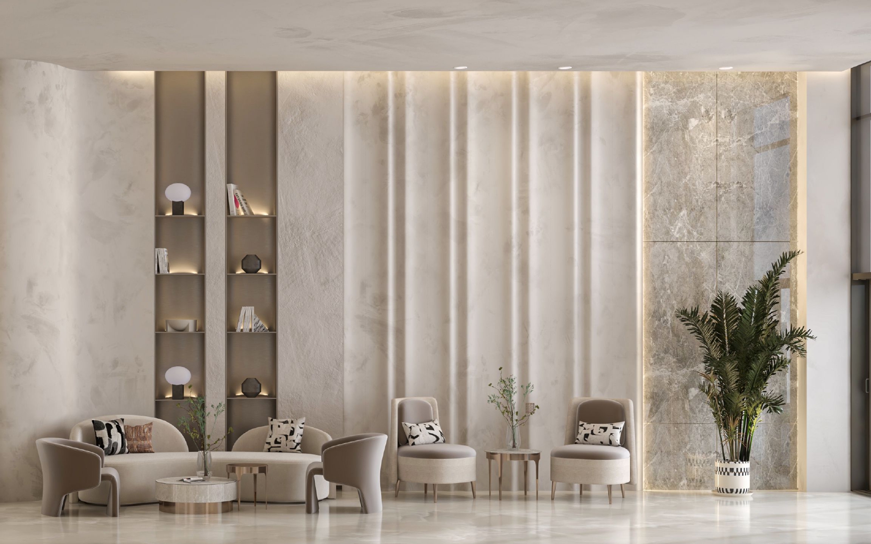 A contemporary reception space designed to create a calm and welcoming arrival experience. The concept is defined by soft architectural curves, layered stone textures, and warm concealed lighting that enhances depth and atmosphere. A neutral material palette combined with carefully positioned lounge seating promotes comfort and flow, while refined detailing adds a sense of understated elegance. The design delivers a serene and sophisticated environment suited to modern hospitality settings.