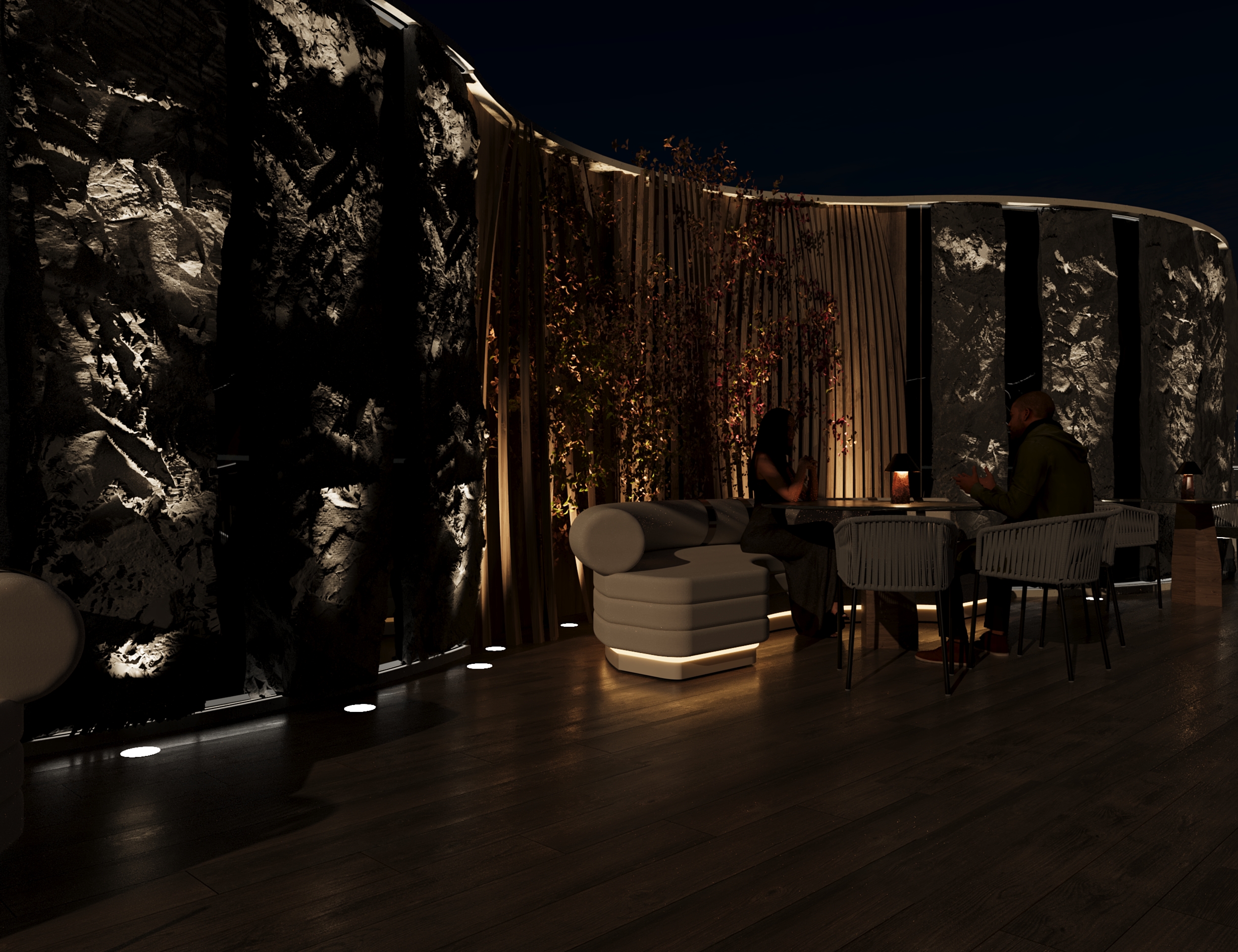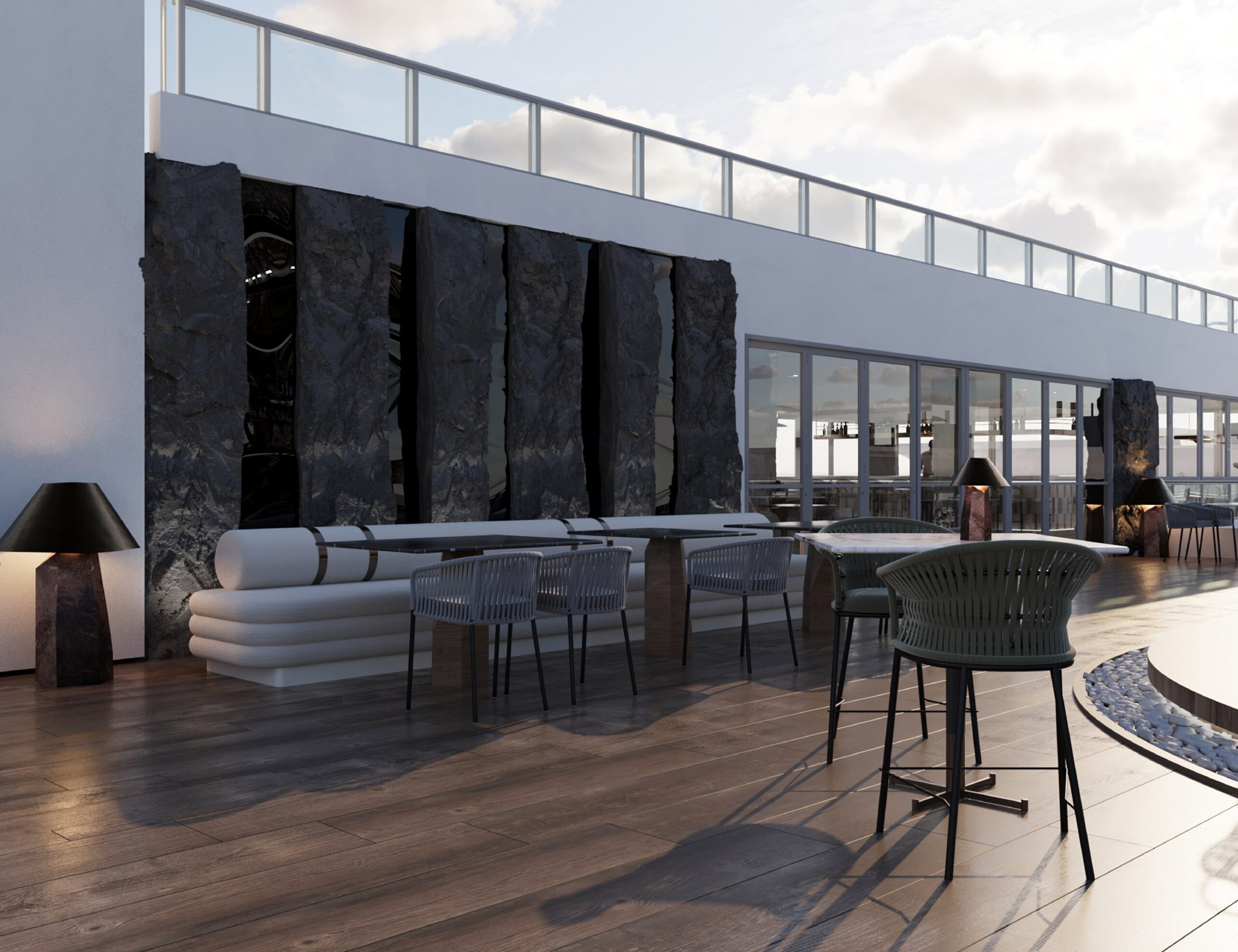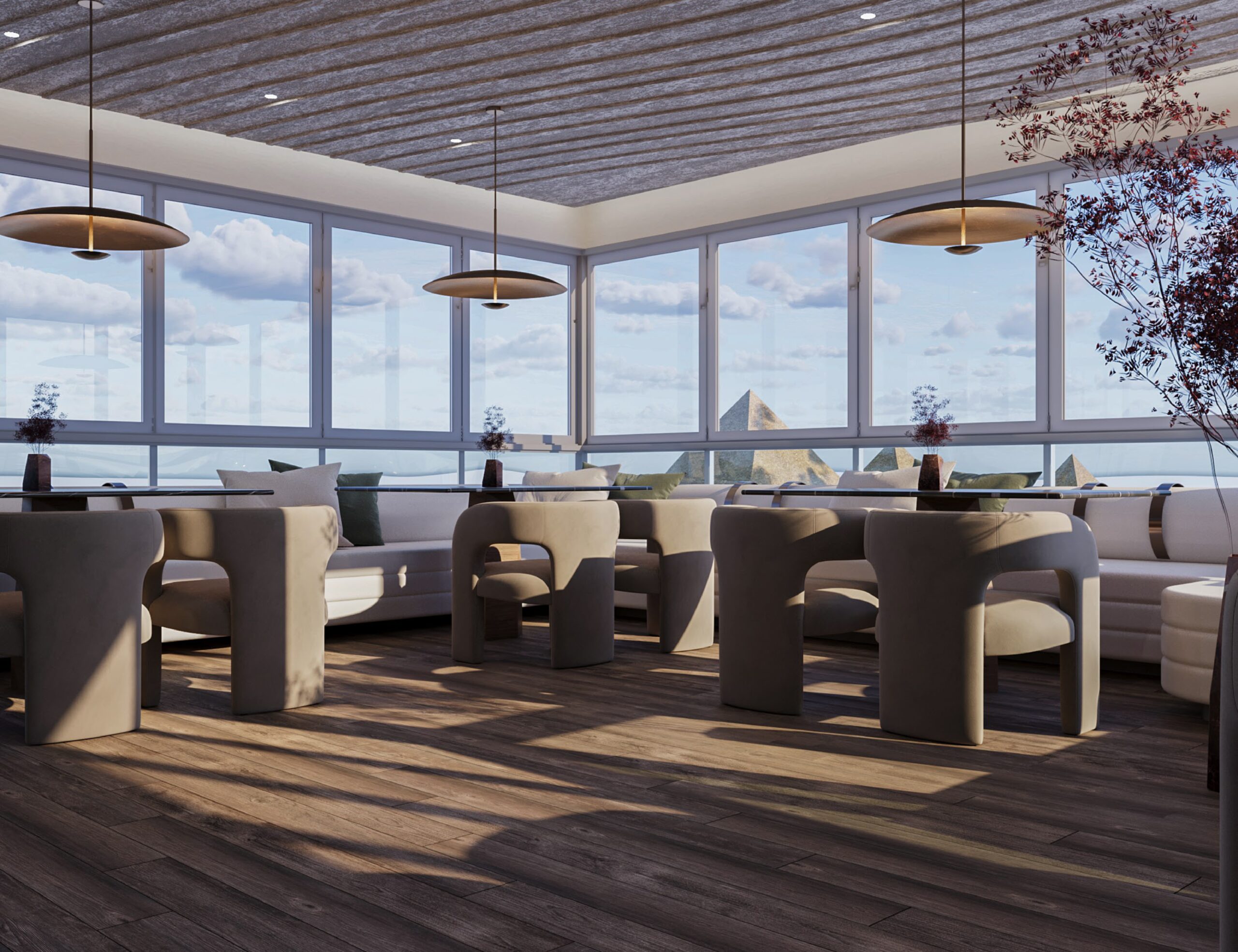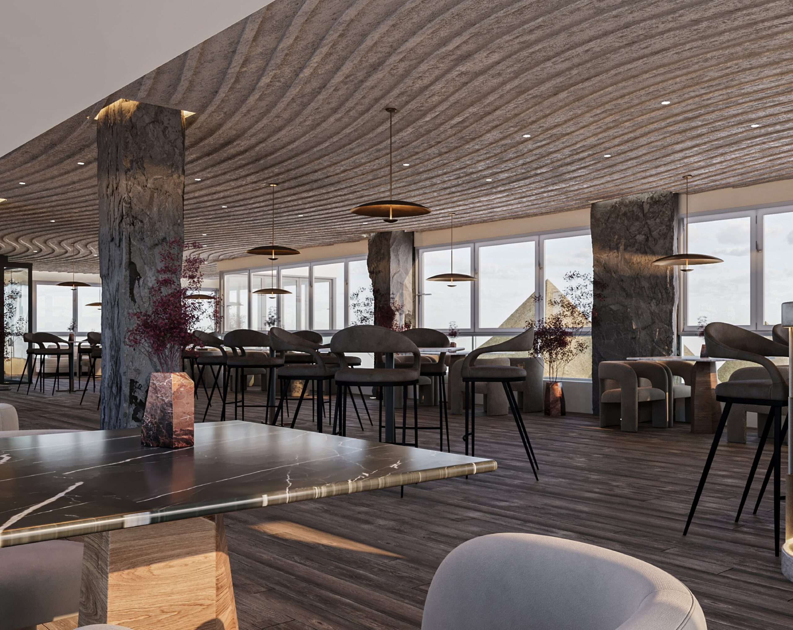 Sand & Stoneoffers a seamless blend of indoor and outdoor seating, each providing stunning views of the Pyramids and the Grand Egyptian Museum. The outdoor area features a striking circular bar, encased in dark grey natural stone blocks that lend a modern, sleek feel while harmonizing with the earthy tones of the surrounding landscape. Guests can savor expertly crafted drinks al fresco or step inside for a more intimate ambiance. This fusion of contemporary design with natural materials creates a distinctive, stylish atmosphere, making Sand & Stone the ideal place to unwind and enjoy the breathtaking views.