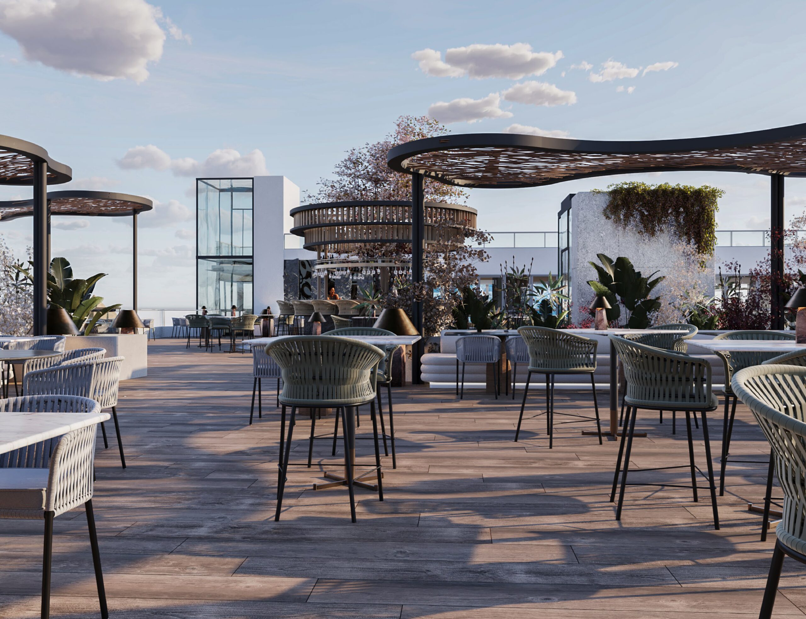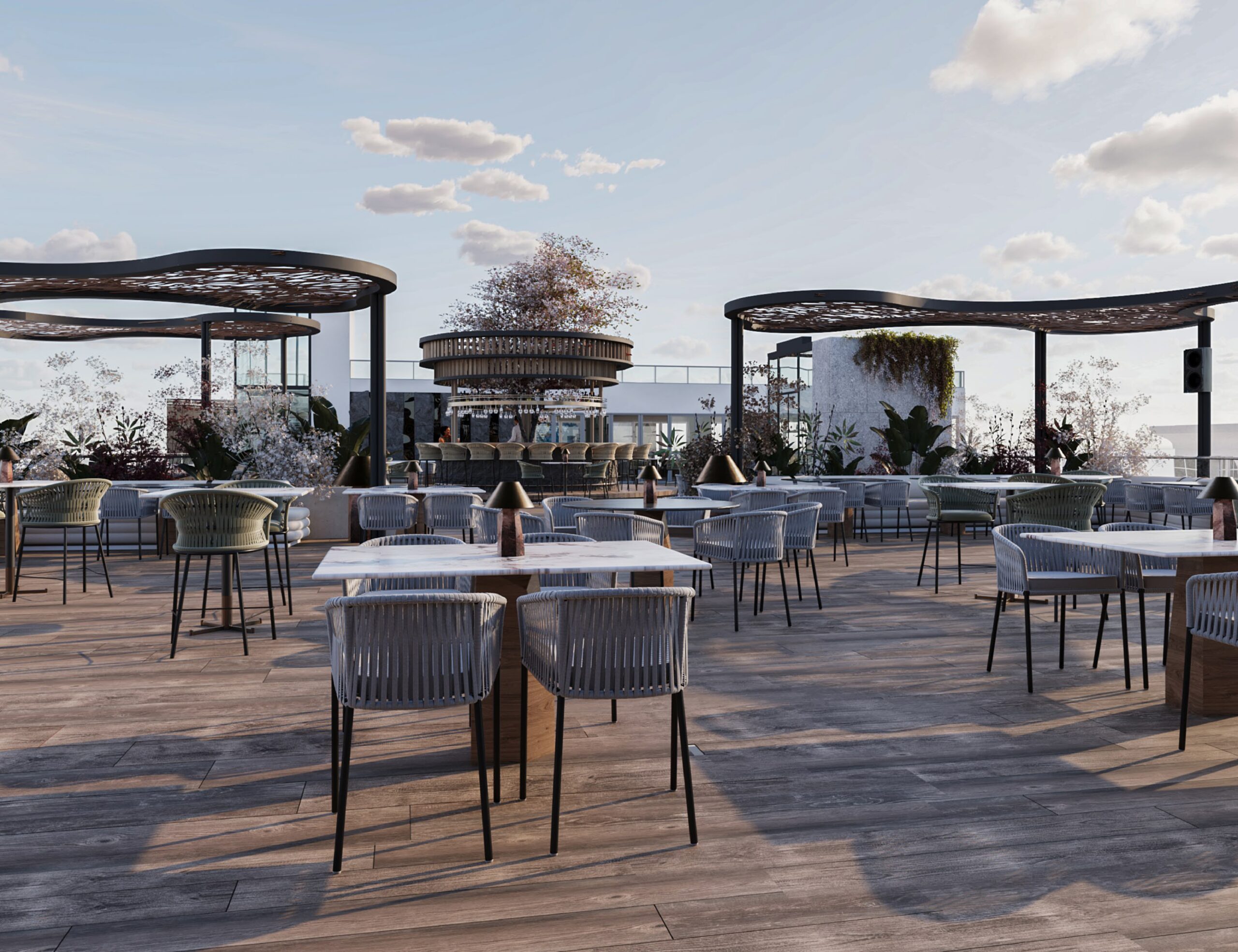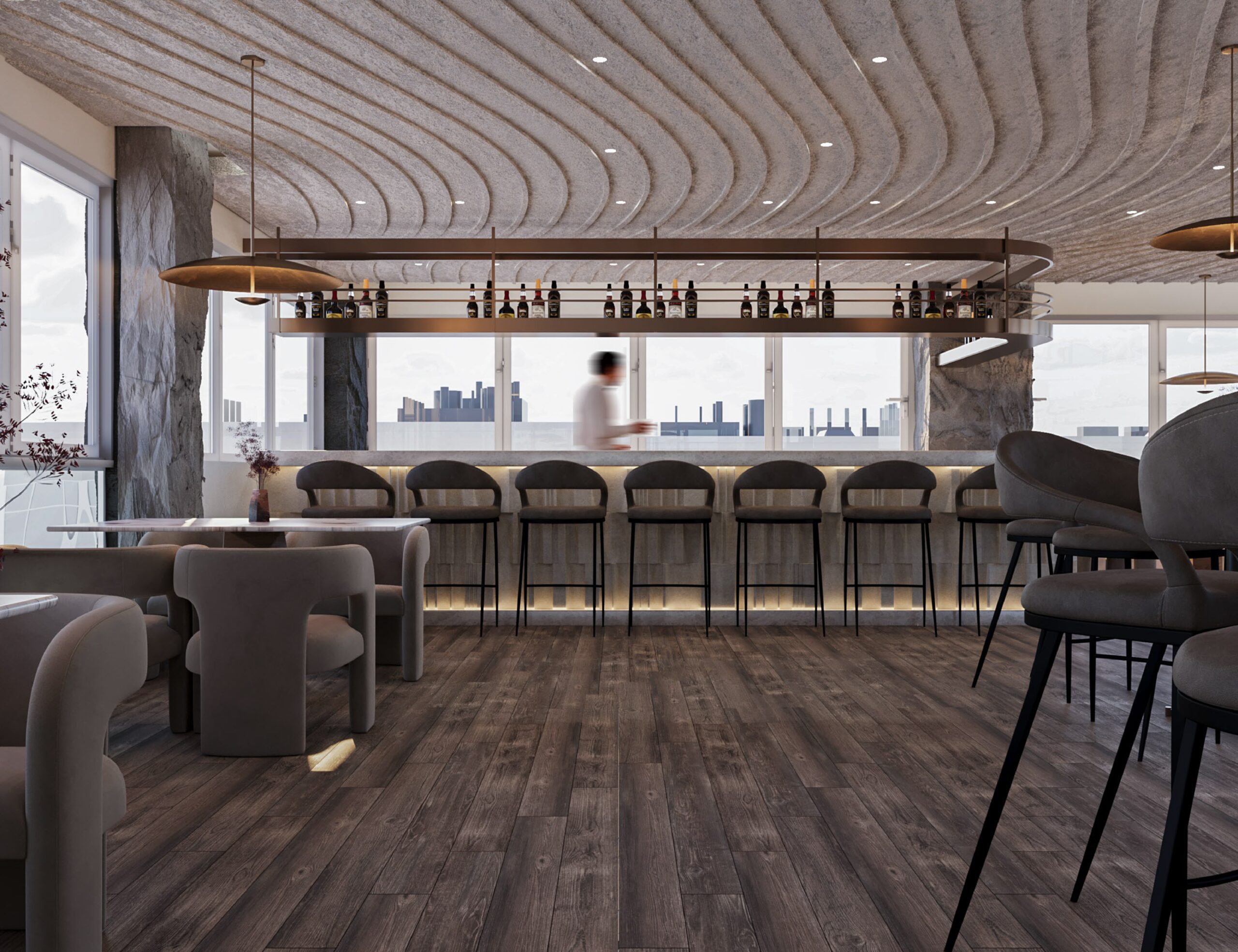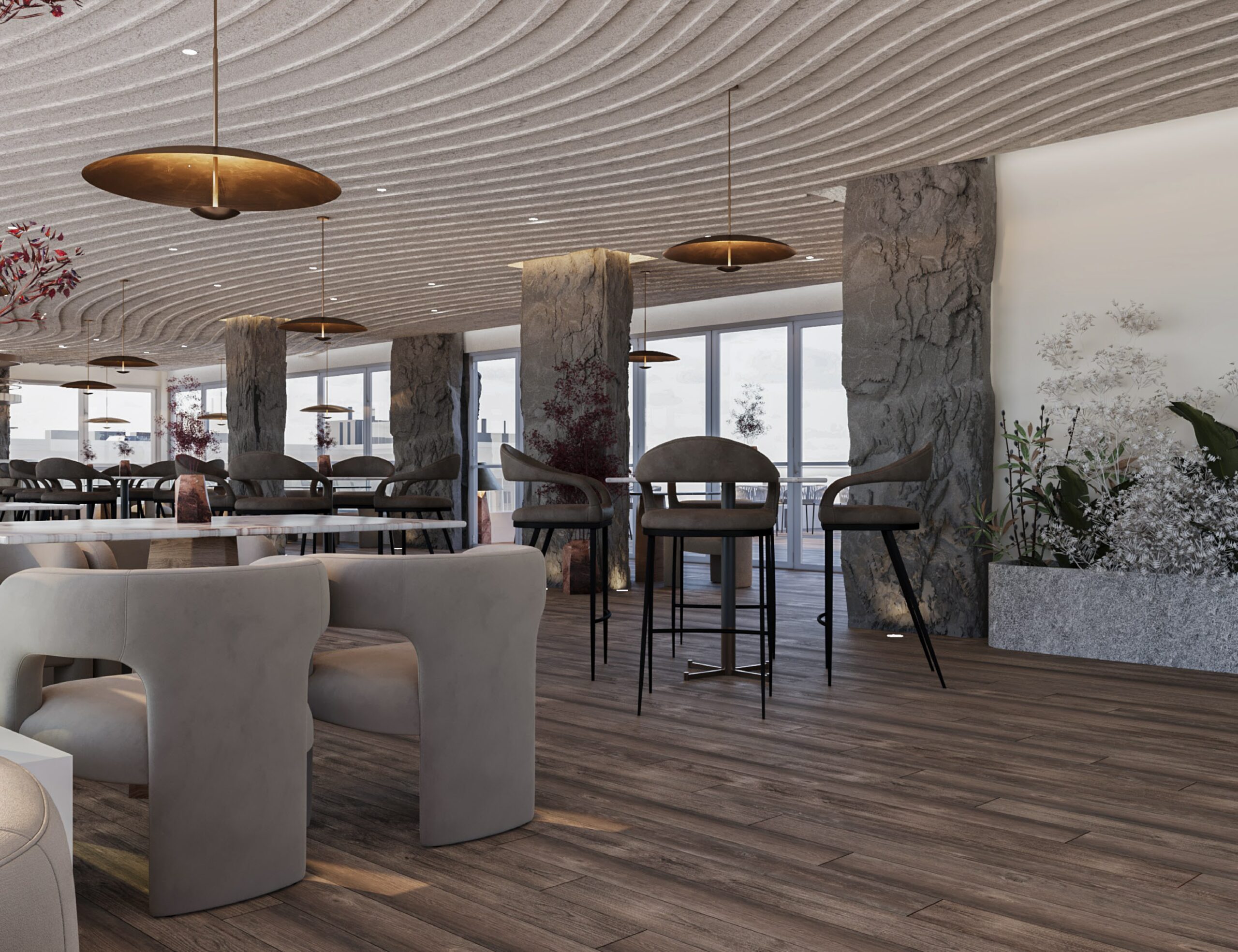 Sand & Stoneoffers a seamless blend of indoor and outdoor seating, each providing stunning views of the Pyramids and the Grand Egyptian Museum. The outdoor area features a striking circular bar, encased in dark grey natural stone blocks that lend a modern, sleek feel while harmonizing with the earthy tones of the surrounding landscape. Guests can savor expertly crafted drinks al fresco or step inside for a more intimate ambiance. This fusion of contemporary design with natural materials creates a distinctive, stylish atmosphere, making Sand & Stone the ideal place to unwind and enjoy the breathtaking views.
